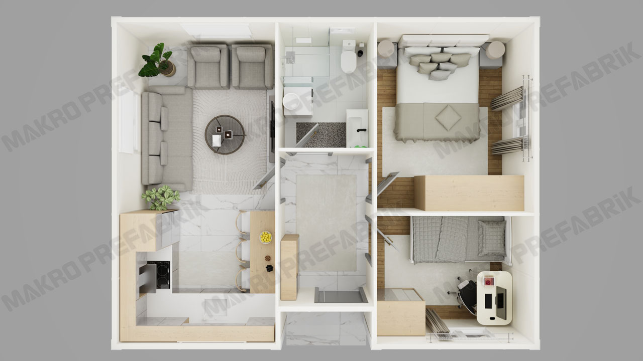 Taşınabilir ve modüler olan prefabrik yapılar sadece bir ev değil, modern, sağlıklı ve teknolojik bir yaşam biçimidir. Ön tarafındaki büyük ve geniş olan pencereler ile birlikte oldukça modern görünen prefabrik ev fiyatları modelimiz, 20 m2 olan salon ve mutfakla iç içe üretilmiş olup oldukça geniş bir yaşam alanı sağlamaktadır. Ön tarafındaki iki pencere ile birlikte banyo penceresi hariç beş bölümde bulunan penceresi ile aydınlatma ile ilgili bir probleminiz olmaz. Pencerelerde, beyaz renk PVC’lerden kullanılmaktadır.