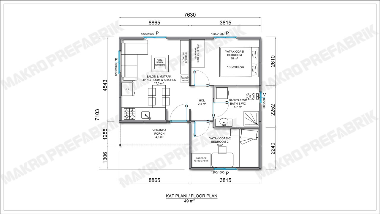 Sessizliği aradığınız arsanıza kuracağınız bu prefabrik ev modeline sahip olabilirsiniz. Bu eve girişler 5 m² verandası aracılığı ile yapılmaktadır. Salon ve mutfak 17 m² ve iç içe konumlandırılmıştır. 10 m² ebeveyn yatak odası ve 10 m² de çocuk yatak odası bulunmaktadır. Bu alanları daha verimli kullanmak adına modüler mobilyalar da tercih edebilirsiniz.